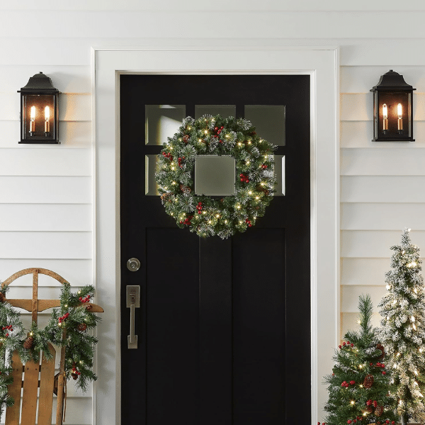 Transform your space into a winter wonderland with this 24-inch Pre-Lit Crestwood Spruce Christmas Wreath by National Tree Company. Featuring glowing white lights, frosted branches, and charming accents, it adds warmth and sparkle to any doorway or wall.