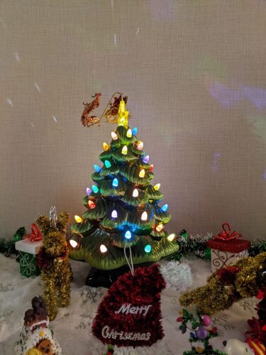 Bring home holiday nostalgia with the Mr. Christmas 90th Anniversary Animated Santa’s Sleigh Tree. This hand-painted ceramic tree features twinkling LED lights and Santa flying around the top in his sleigh for a magical touch.