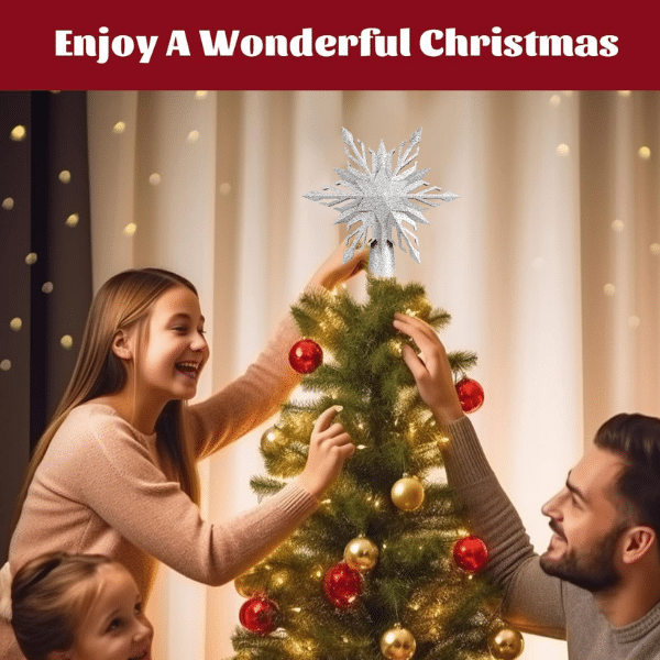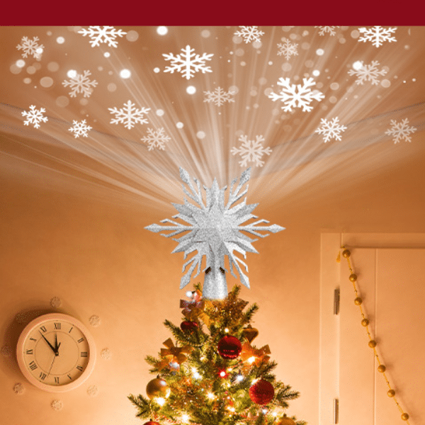 Make your holiday season unforgettable with the Christmas Star Tree Topper! Its sparkling silver design and built-in 3D rotating snowflake projector create a mesmerizing snow scene.