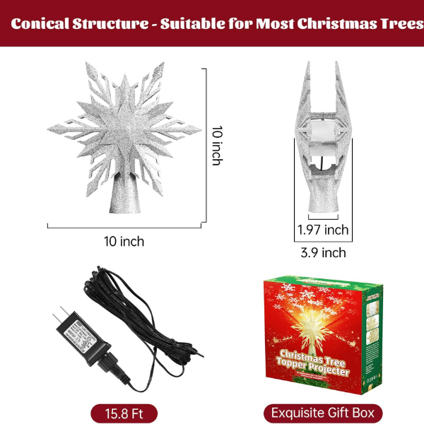 Measuring 10 x 3.9 x 10 inches, this tree topper is suitable for most Christmas tree sizes. The long 15.8 ft power cord ensures flexible placement, while the lightweight design makes installation quick.